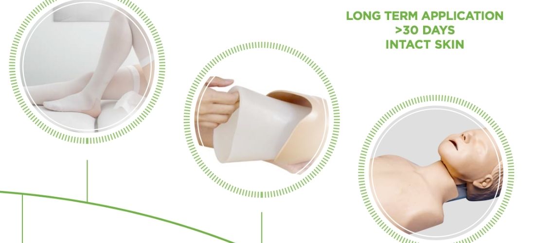 Zhermackin SFX10 ja SFX0020 silikonit ovat ihoystävällisiä ja soveltuvat pitkäaikaiseen ihokontaktiin. Tuotteet on testattu lääketieteelliseen käyttöön ja ne ovat turvallisia käytettäväksi ehjällä iholla yli 30 vuorokauden ajan.